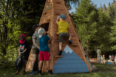 Wspinaczkowe tipi, kuchnia błotna, piaskownica, duża polana do gier, zabaw i podchodów, leśna strefa do budowania szałasów itp.